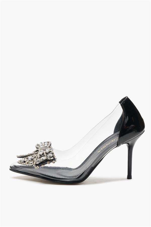 Majensia 155009 Taş Detaylı Şeffaf İnce Topuklu Siyah Rugan